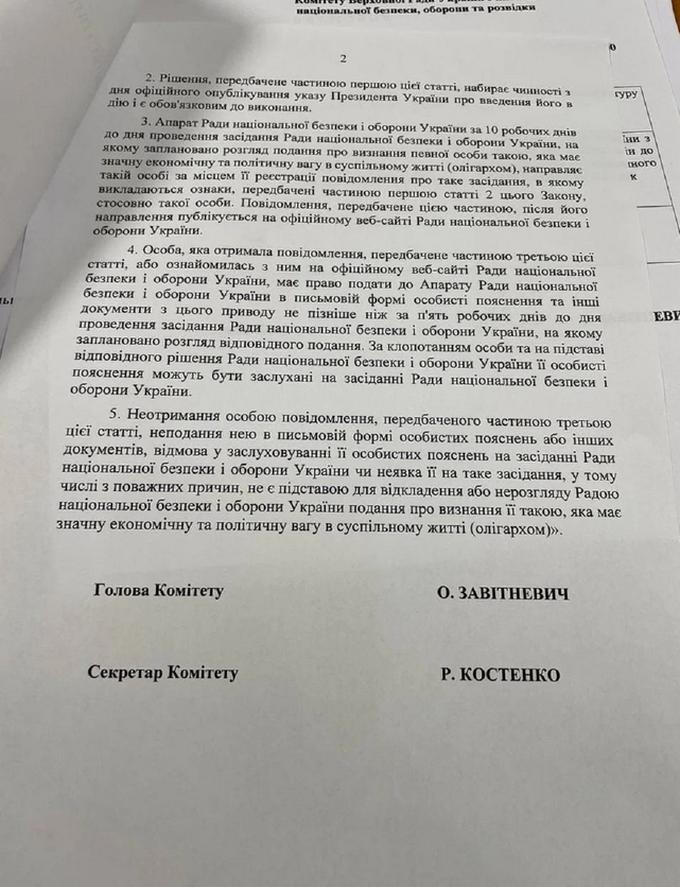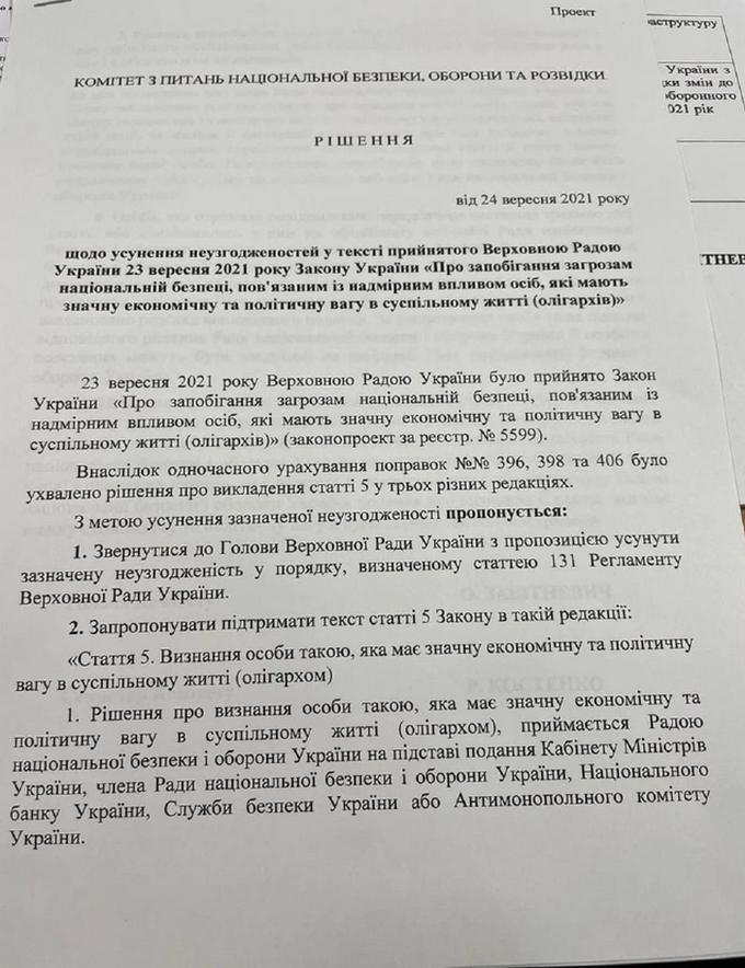 Перед этим спикер Верховной Рады Дмитрий Разумков заявил, что парламентарии поддержали его правку, и решение о признании человека олигархом будет принимать НАПК, а не СНБО, как это инициировал президент.