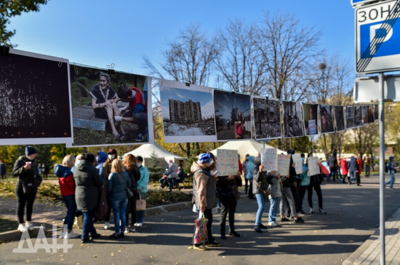 Протестующие разместили перед парадным входом в гостиницу фотографии, на которых запечатлены последствия преступлений украинских войск в Донбассе.